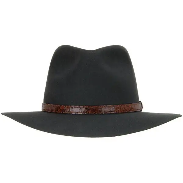 The Banjo Paterson from Akubra’s Heritage Collection of outstanding hats is a great style suitable for town or country wear, named after the Australian poet and writer. The pre-creased crown has a wide center crease with side dents in the front. The crown is 4 inches high at the front, 4-1/2 inches at the sides. The brim is 2-3/4 inches wide. The striking hat band, 1/2 inch wide, is made from the skin of the Barramundi, one of Australia’s fine food fishes found in the Condamine and other northern rivers of Australia. Premium quality pure fur felt, fully lined. Reeded roan leather sweatband. UPF rating 50+. Made in Australia.