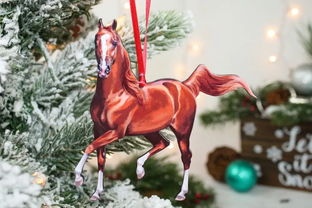 Here’s a stunning chestnut Arabian Horse ornament. This hand made 1/8″ thick composite wood laser cut horse would look great on the tree for Christmas or sitting on your mantle. Arrives in a gift box. Perfect for gifting to a friend or to enjoy yourself.