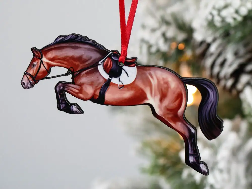 Here’s a scopey bay hunter jumper. This jumping horse ornament comes with a ribbon for hanging. This hand made 1/8″ thick composite wood laser cut horse ornament would look great in the barn lounge, on the wall, on a Christmas tree during the holidays, on the mantel or wherever is most fitting in your life. Perfect for gifting to a friend or to enjoy yourself. Arrives in a gift box ready for gifting.