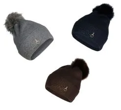 The new Leona hat is soft and lined with cosy fleece. Subtle crystals add a luxurious touch. A faux fur pom pom looks wintery, and the silver metal bit detail completes the rider look