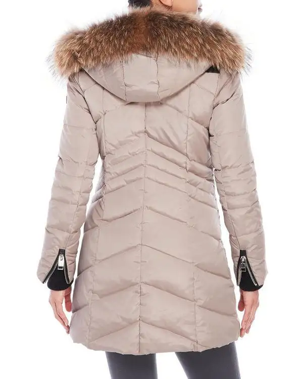 - Allover quilted stitch, zip front closure, attached hood with snap-down real fur trim, long sleeves with rib knit cuffs