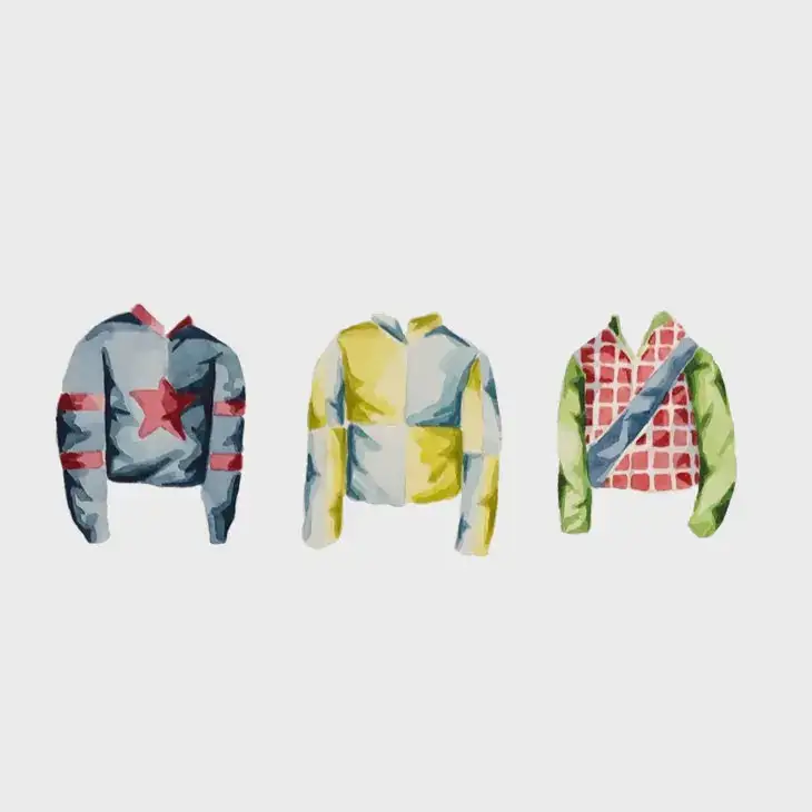 White cotton Hand Towel with hang loop 17″ x 30″ Information tag includes: Jockeys wear the horse owner’s choice of silks, and their patterns and colors must be registered with the racing commission at the racetrack. There are over 20,000 silks registered worldwide through the jockey club. Bright and colorful silks help identify the horse during the race. Early on, silks were made of silk, but today nylon and lycra are the preferred fabrics because of their durability. These fabrics are also beneficial because they can be more form-fitting, adding an aerodynamic advantage.