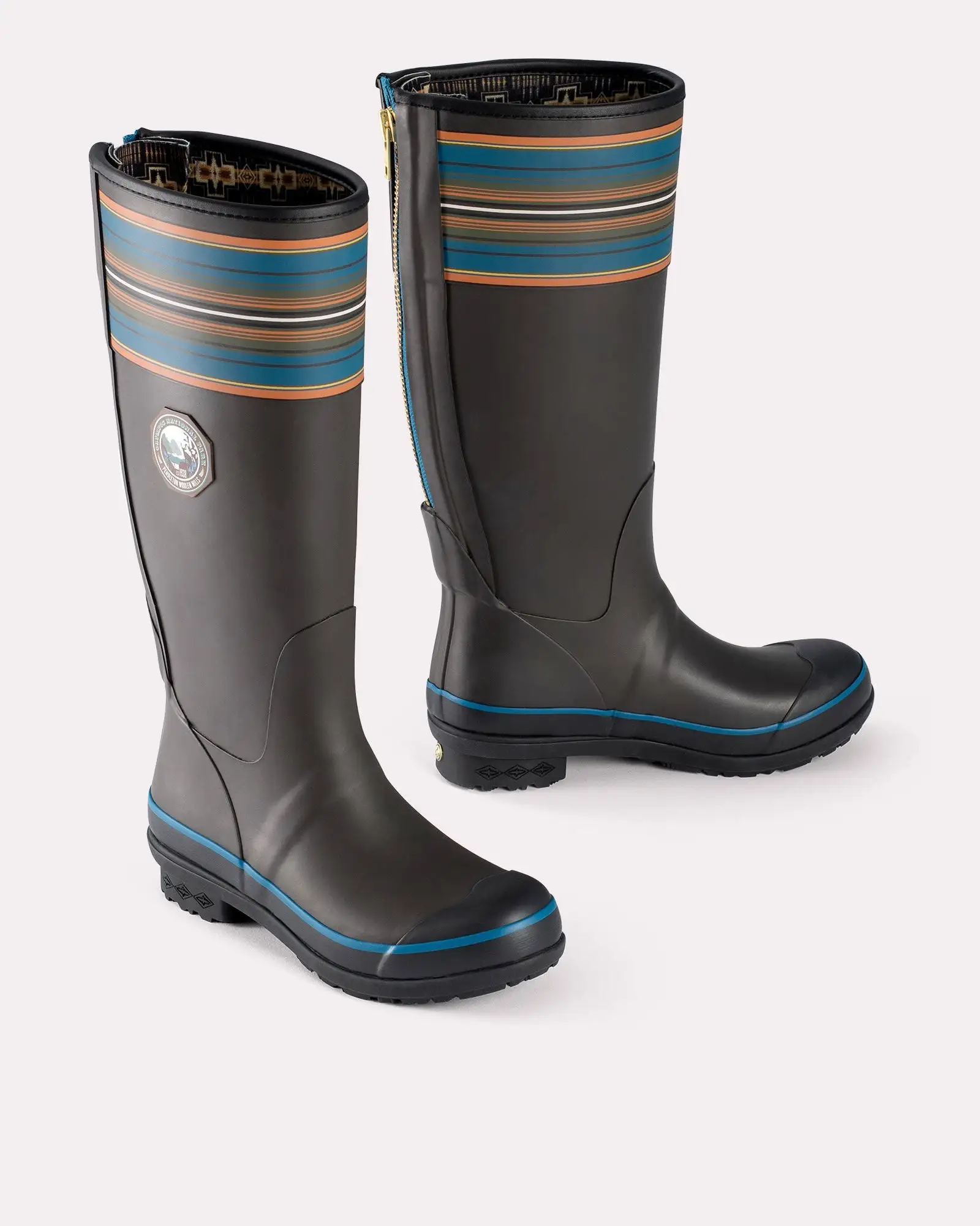 Splash-happy, womenās rain boots emblazoned with our beloved National Park stripes and vintage logo. Constructed of premium rubber with slip-resistant soles and exclusive Mountain Majesty tread. Cushioned insoles and internal shank system provide all-day comfort and support; back zipper allows for easy on-and-off. Moisture-wicking linings feature our iconic Harding pattern.Ā